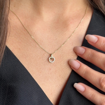 Acești cercei rafinați aduc un plus de eleganță oricărei ținute. Realizați din aur și decorați cu un pandantiv circular împodobit cu zirconii fine, cerceii îmbină perfect stilul modern cu delicatețea clasică.